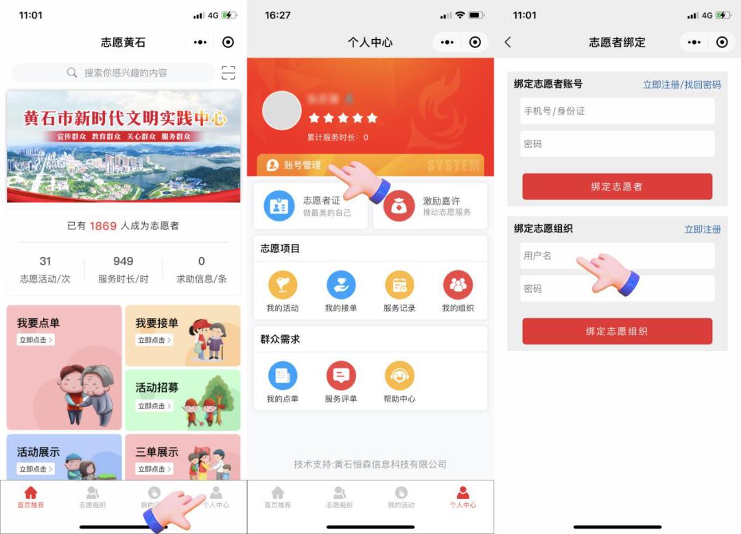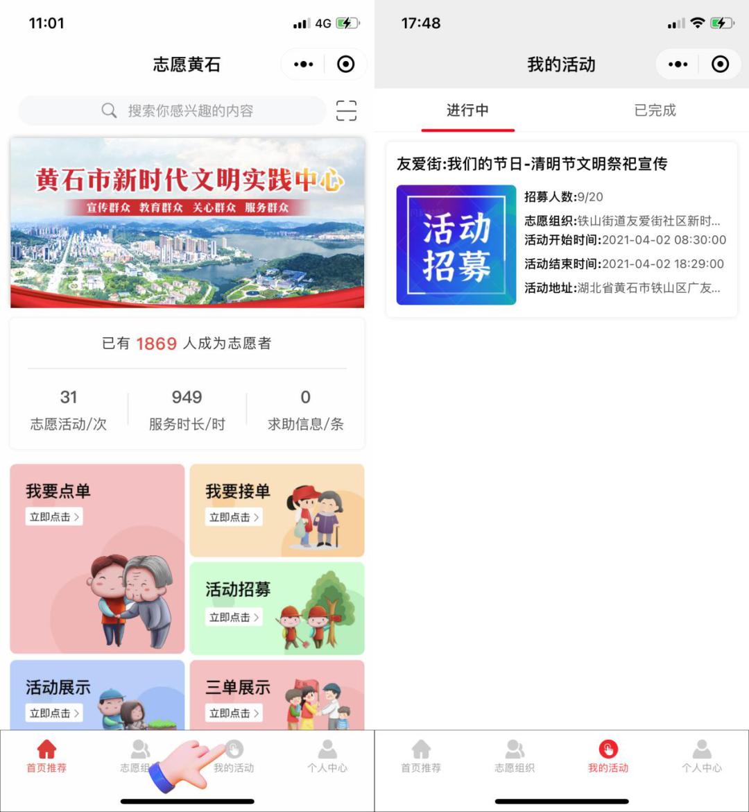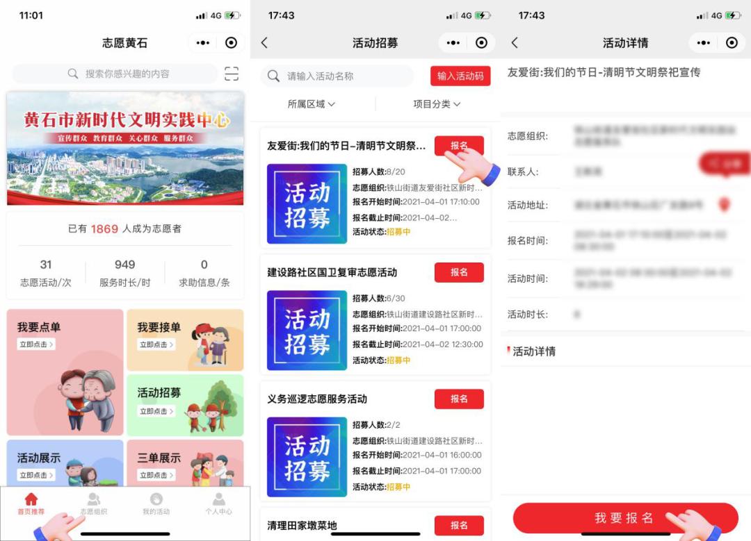 “志愿黄石”微信小程序是面向全市志愿者的服务管理平台,主要用于志愿者组织和志愿者管理、志愿活动招募、签到 管理、数据统计发布等,具有志愿服务注册、记录、统计、发 布、展示、学习、管理、激励等核心功能,志愿者注册使用该 平台,可随时随地参与志愿服务,记录志愿服务时长,操作简 便。推广使用“志愿黄石”微信小程序,对于激励全市广大志 愿者投身公益事业,整合志愿服务资源,扩展志愿服务广度和 深度,加强社会信用体系建设,推动我市全国文明城市创建具 有重要作用。“志愿黄石”操作指南