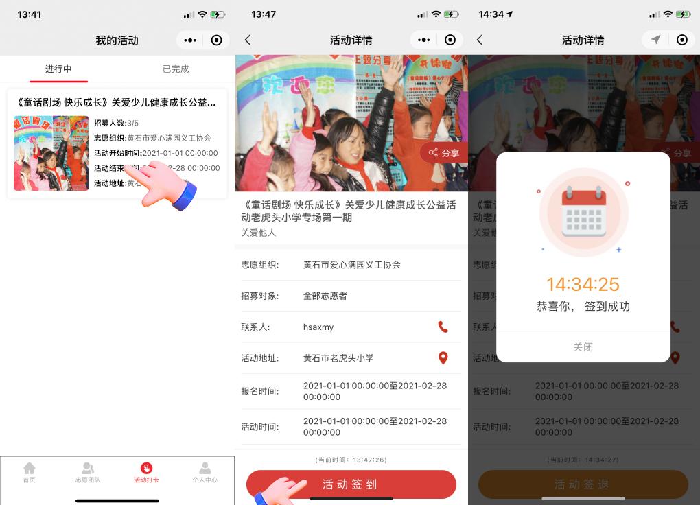 当活动开始前到达活动地点,在“我的活动”列表页,点击进入进行中的活动,点击“活动签到”进行签到,活动完成之后点击“活动签退”,活动完成后系统将自动记录你的活动时长。