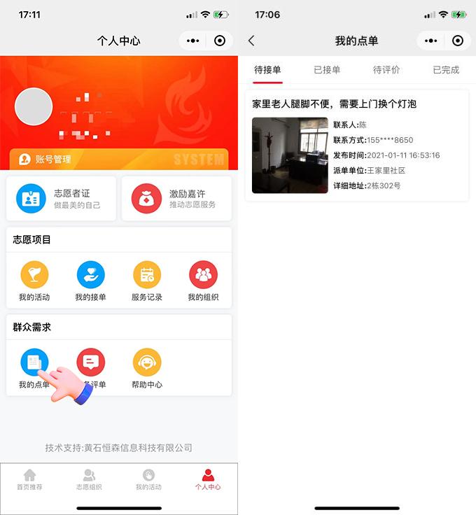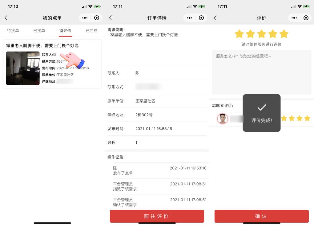 3、群众评单志愿者完成服务后,群众可以在个人中心“我的点单“页面本次服务进行评价。