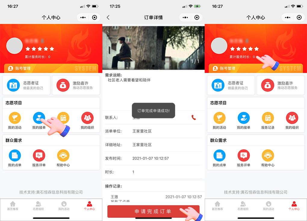 2、完成服务志愿者完成服务之后,进入个人中心"我的接单"中,点击申请完成订单并上传图片,等待后台审核。后台审核完成后系统将自动记录你的服务时长。