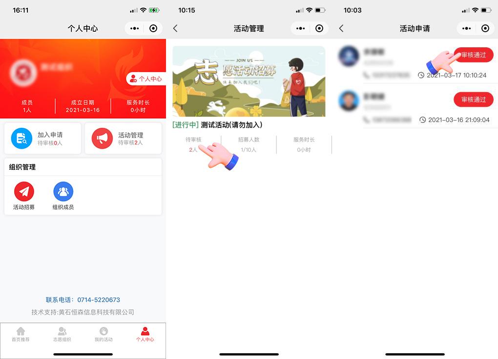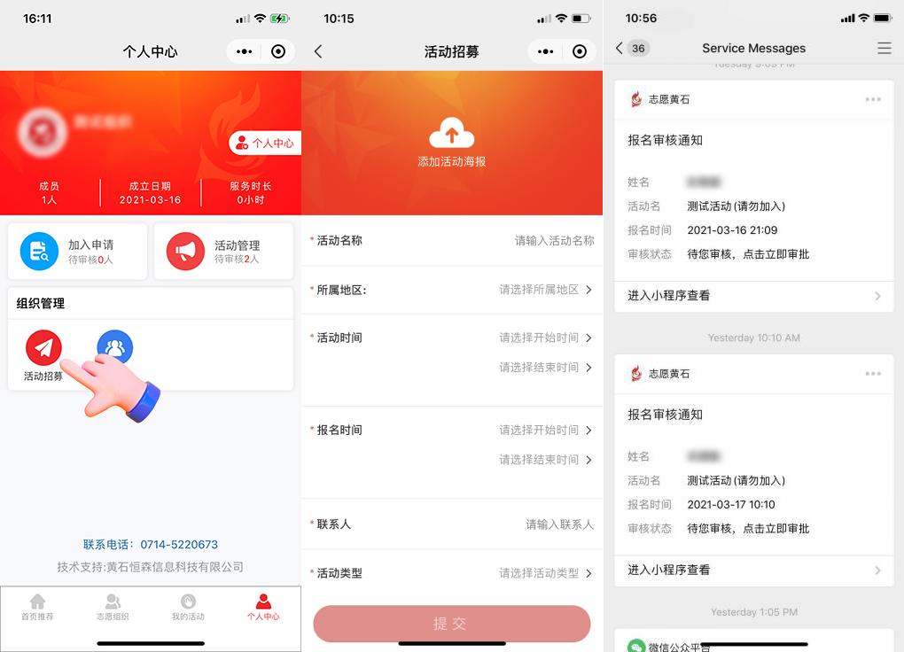 当有人申请参与活动时会向用户微信发送申请通知,进入组织管理中心,点击“活动管理”查看待审核列表完成操作。