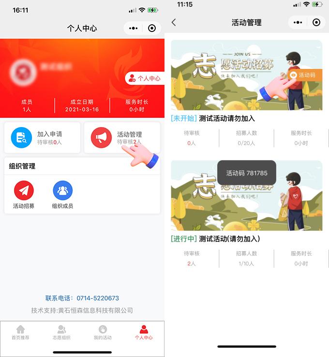 在组织管理中心点击"活动招募"开始发布志愿活动,填写活动详情点击提交完成活动招募。