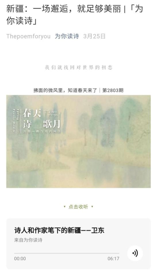 当即,“为你读诗”微信公号发布以“新疆:一场邂逅,就足够美丽”为题的特别推送,呈现诗人和作家笔下的大美新疆;“诗刊社”也发布新疆诗人陈建斌关于棉花的诗《从泥土里长出来的云——给我亲爱的家乡》,并继而推出了三辑“‘新疆棉花’同题诗”。这些推送以文艺的方式有效回应了现实,读者们在公众号中分享自己对新疆的印象,在关于诗歌的讨论中凝聚民族共同体意识。从中我们欣喜地看到,新媒体不但激活了诗歌作为一种文体的生长力量,而且向人们证明,在个人化、碎片化写作的时代,诗歌足可以充当纽带,凝聚人心、介入现实。