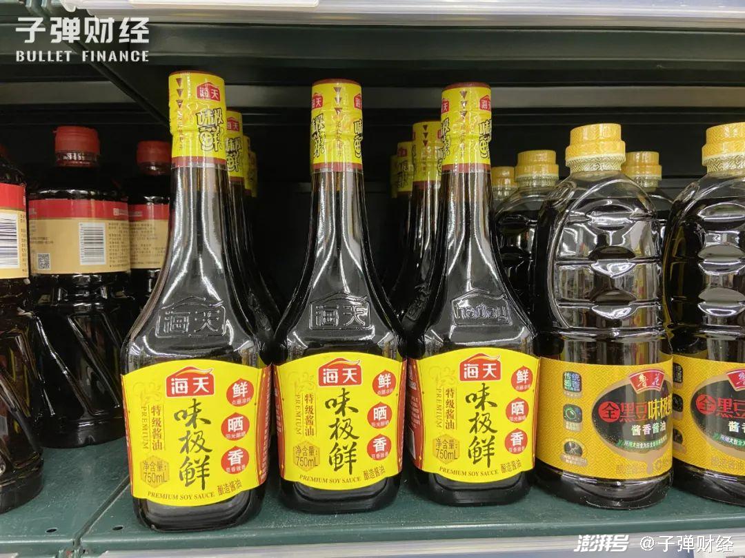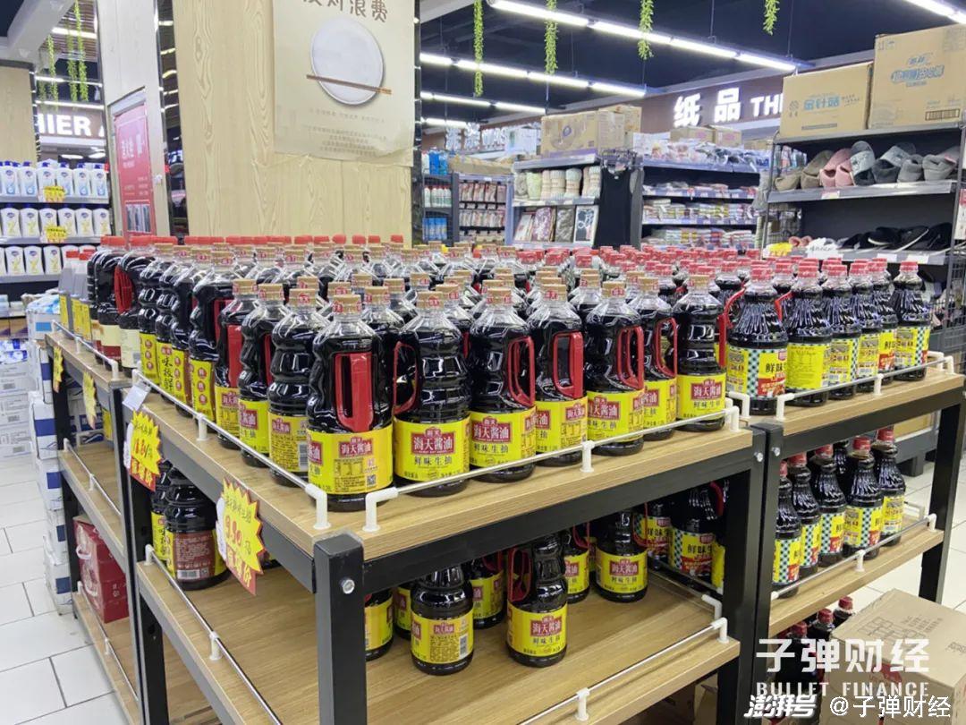 「子弹财经」在北京市朝阳区多家超市内看到,在酱油产品陈列区,海天酱油、蚝油等产品种类繁多,占据的货架陈列位远甚于其他品牌产品。