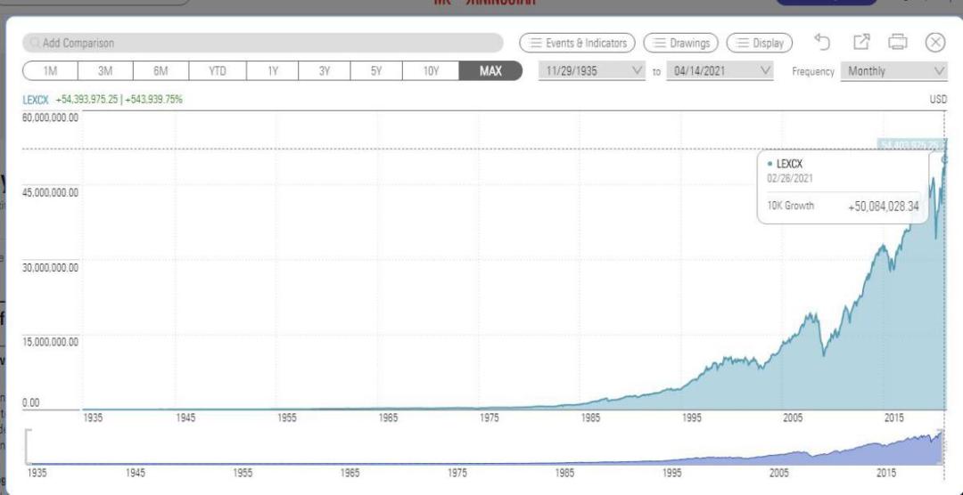 尽管在成立后的80年时间中,LEXCX经历了诸如二战、两次石油危机、70年代的经济滞胀、“漂亮50”泡沫破裂、亚洲金融危机、2008年金融危机等重大事件的考验,但它的投资策略始终如一,并在此后的85年里获得了年化10.58%的复合收益率(此收益率包含税费)。