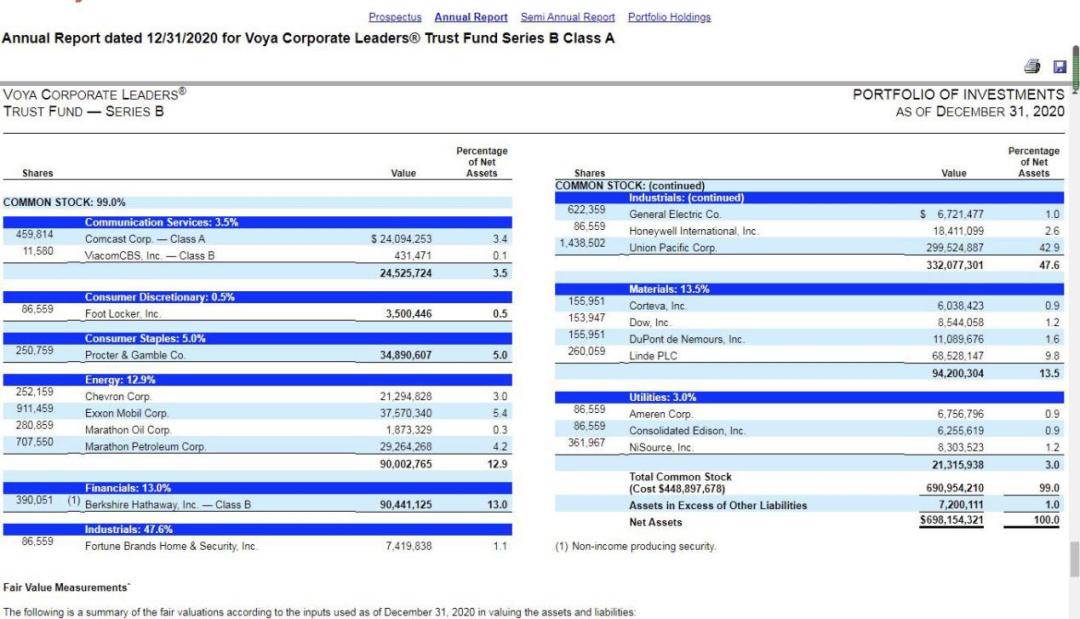 截至2020年底,LEXCX的前十大重仓股分别是联合太平洋、伯克希尔哈撒韦、林德集团、埃克森美孚、宝洁公司、马拉松原油、康卡斯特公司(一家有限电视、宽带网络及IP电话服务供应商)、雪佛龙(世界最大的能源公司之一,可以追溯到1911年)、霍尼韦尔(自控产品开发及生产巨头,成立于1885年),杜邦(世界化工企业巨头,成立于1802年)。
