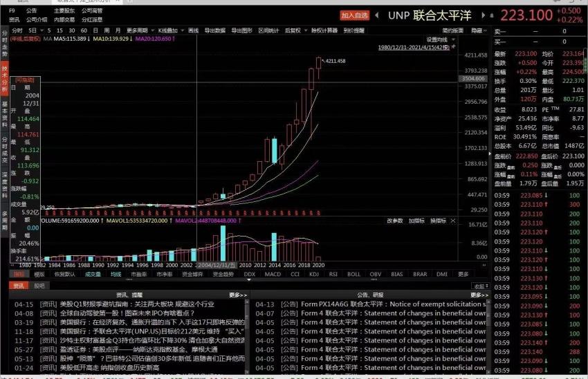 如果从1980年的低点算起,联合太平洋上涨了140倍,当前市值为1500亿美金。2020年财报显示,联合太平洋的收入为195亿美金,归母净利润为53亿美金,经营活动产生的现金流净额为85亿美金,净资产收益率为30.49%,这家百年铁路企业历久弥坚,基本面依然强劲。