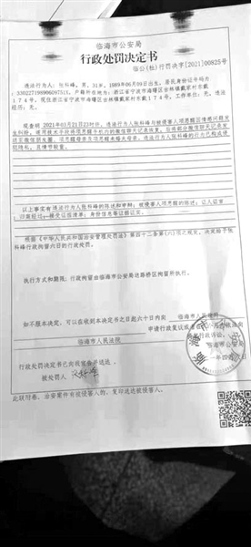 临海警方出具的行政处罚决定书。