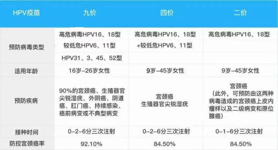 总之呢,就是HPV病毒大家族里有200多个基因型,但能搞事情就那么几个型别,其中最主要就是16、18型,我国84.5%的宫颈癌都是由这两个型别导致,而二价HPV疫苗就是针对这两个型别的。下面这个表,让你对二价、四价、九价疫苗有个更清楚的认识~