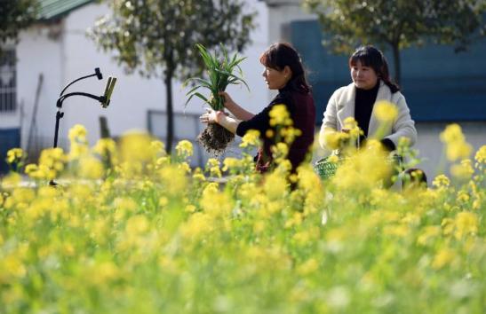 3月4日,在合肥舒城县南港镇公义村钱元玲家庭农场,钱元玲(左)向直播间网友展示采摘的蔬菜。周牧摄( 新华社)