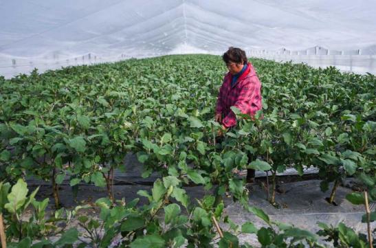 3月10日,在浙江嘉善县姚庄镇现代农业小微产业园的大棚内,农民在查看茄子长势。徐昱摄(新华社)