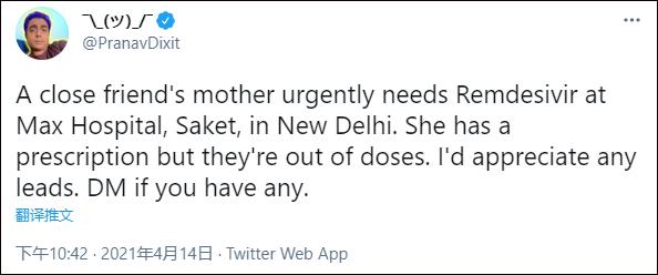 “一位密友的母亲急需瑞德西韦。她有处方,但没药了。”一名来自新德里的印度人14日在推特发文,请求外界帮助,“如果有任何线索,我会很感激”。