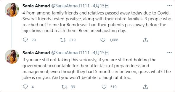 4月15日,一名印度网民写道:“今天,家中有4人死于新冠肺炎。几个朋友和他们的全家都呈阳性。有三个找到我要瑞德西韦的人说,他们的病人在注射药剂之前就去世了。”她随即将此事归咎于政府“缺乏准备和管理”,并提醒人们认真对待防疫。
