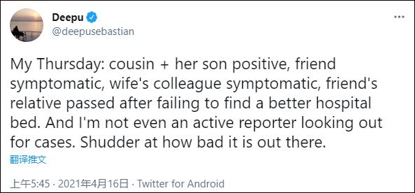 这样的悲剧在印度并不是单例。印度新闻记者迪普(Deepu Sebastian)16日称,当天,他的表亲及其儿子、朋友、妻子的同事相继出现感染症状,还有一名朋友的亲戚在找不到床位后去世。他写道:“外面的情况太糟糕了。”
