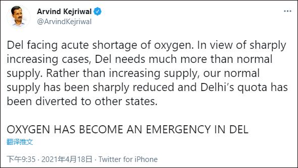 此外,凯杰里瓦尔18日在推特发文称,由于病例激增,德里面临着严重的氧气和床位短缺。其中一个原因在于,德里的氧气供应大幅减少,配额被转移到了其他邦。