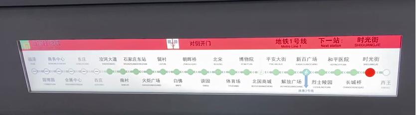 2.车门上方的动态地图,有运行路线,动态地图会显示终点站。小交路的动态地图显示西庄站-福泽站图标关闭,运行的大交路动态地图显示所有车站图标打开。列车在驶出站台时,车厢内的广播会及时进行终点站播报。