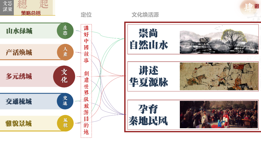 (3)文旅篇:内环外放的空间轴线、依托华清宫—始皇陵构建的空间双十字空间轴线与Y字发展轴线串联三级节点;以三大主题旅游线路形成网,以秦风唐韵三大片区为底,畅想“涵文乐康的文旅之城”。