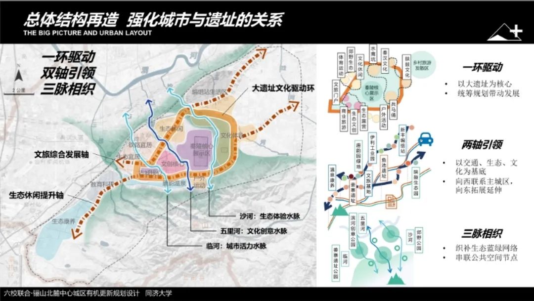 同济大学团队基于价值再认知,提出“遗+山水,焕彩临潼”的设计主题。使用“要素梳理-体系重构-体验焕活”的战术思路,定制空间策略体系,即“山河之吻创生境,古今相织造文境,城陵相拥兴家园”。