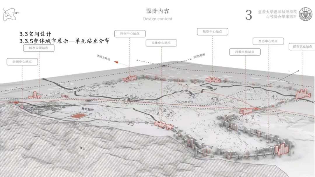 团队借助初步选地,呈现了诗画古城、青山朱苑、怀秦乐乡三个小地块设计,从城、郊、野三方面对设计概念进行具体阐述。