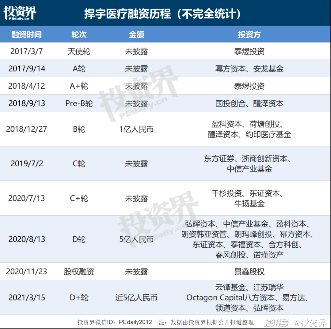 捍宇医疗完成C+轮融资后,仅仅过了30天后,公司高调完成5亿元D轮融资,该轮融资由弘晖资本、CPE、盈科资本联合领投,朗姿韩亚、朗玛峰、幂方资本、东证资本、泰福资本、合方科创以及春风创投跟投。