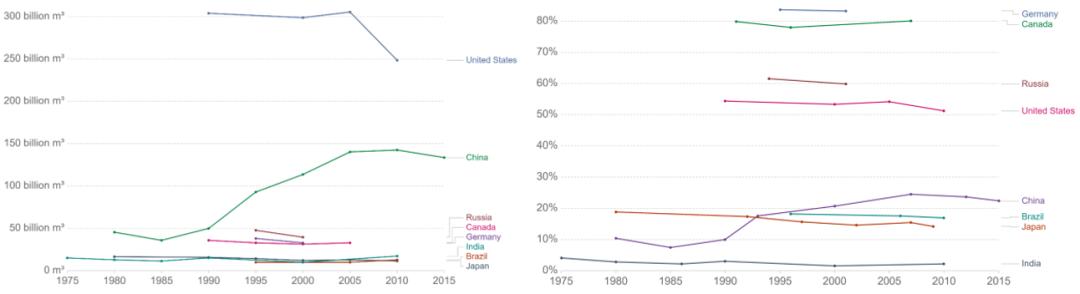 人均可再生资源量取决于两个基本因素:可再生流量和人口规模。即便可再生水资源总量保持不衰减,人口规模的快速增长,也会造成众多国家的人均可再生淡水资源量及世界平均水平不断下降(图2左)。以水资源最丰富的国家巴西为例。1962年巴西人口为7651.43万人,2014年增加到20276.37万人,是1962年的2.65倍,跻身世界第五人口大国,仅次于中国、印度、美国与印度尼西亚。此消彼长,其人均可再生淡水资源量则由1962年的73929.21立方米下降到2014年的27721.04立方米,仅为1962年水平的37.5%(图2右)。
