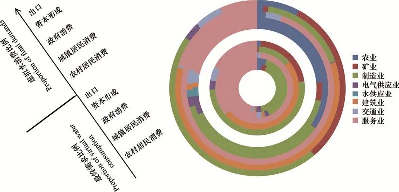 图13,中国省际间虚拟水置换,来源http://doi.org/10.13209/j.0479-8023.2019.117城镇化和工农业的迅速发展使城市用水量日趋增加,从贸易和消费的角度核算虚拟水可为城市水资源管理提供新视角。《生态学报》2018年的一篇文章就分析了北京市的虚拟水核算,发现其为虚拟水净进口城市,进口量相当于用水总量的82%,农业和制造业是主要虚拟水进口部门。文章指出,北京市虚拟水出口结构不合理,出口产品的虚拟水占最终消费隐含虚拟水85%,同样主要发生在农业部门,建议减少出口虚拟水含量大且经济价值不高的农产品(图14)。