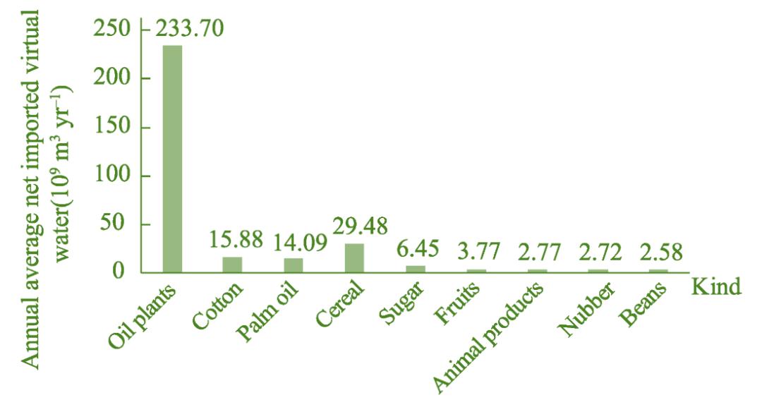 虚拟水概念及其理论已经在一些水资源短缺的国家和地区得到了应用。约旦、以色列等干旱国家开始有意识地制定规划政策来减少高水分产品出口,特别是约旦通过虚拟水形式进口了所需的80%-90%的虚拟水。据估算,中东地区每年靠粮食贸易购买的虚拟水数量相当于整个尼罗河的年径流量。《资源与生态学报》2019底的一篇研究计算了“一带一路”沿线65个国家的水资源承载指标,并分析了我国重点大宗农产品国际贸易的净进口虚拟水含量,认为虚拟水进口能提高中国水资源承载潜力。2012-2016年间,大豆为主的油料作物年均净虚拟水进口量高达2337亿立方米,其次是谷物和棉花(图15)。
