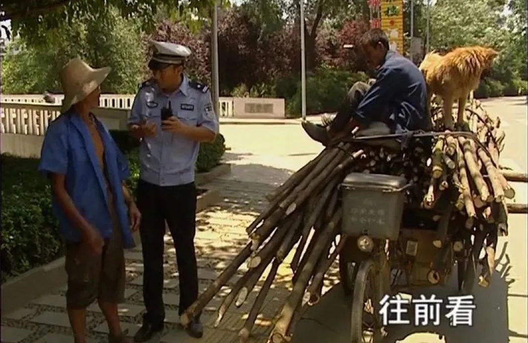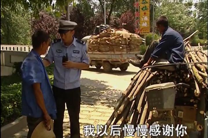 谭警官叫停了三轮车,跟蹬车大爷了解了一下情况。大爷说,车上的柴禾是专门拉去卖给工厂的,打成锯末,要做成茶几、写字台、立柜等家具。小小的三轮车上竟载着重达七八百斤的木头。谭警官说,对大爷的第一印象就是“特别的酷”。听到这话,大爷咧开嘴笑道:“很帅气”,说完又有些不好意思地向后靠了靠。谭警官夸赞大爷,一看就是性格特别开朗的那种人。说完后开始进入普法的正题。