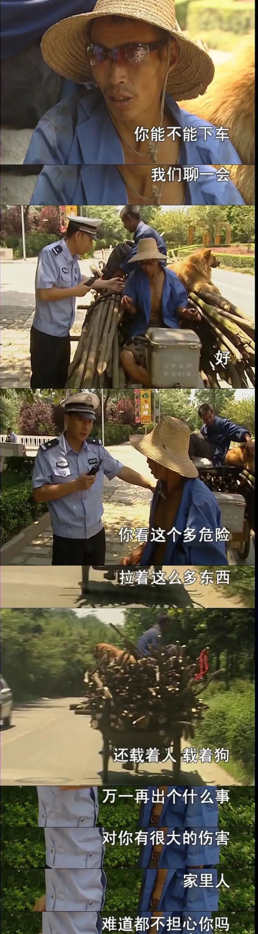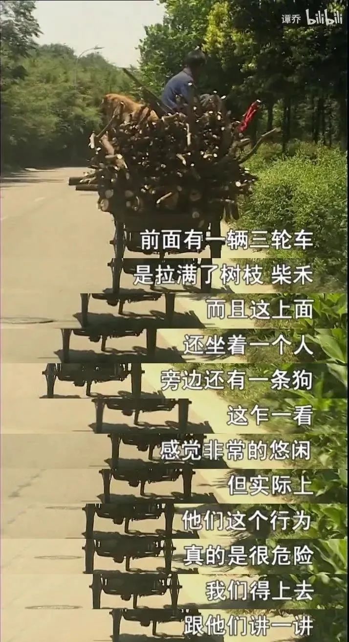 原本是一次寻常的巡视。交警支队民警、主持人谭乔看到一辆载满树枝和柴禾的脚蹬三轮车在路上晃晃悠悠地行驶着。除了驱车的人外,柴禾上还坐着一个人与一条狗。看似悠闲的景象,实际上是很危险的交通行为。