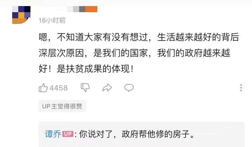 也有网友注意到一个细节:大爷生活改善的背后,是扶贫成果的体现。对此,谭警官深表赞同,因为“大爷的房子就是政府帮修的”。