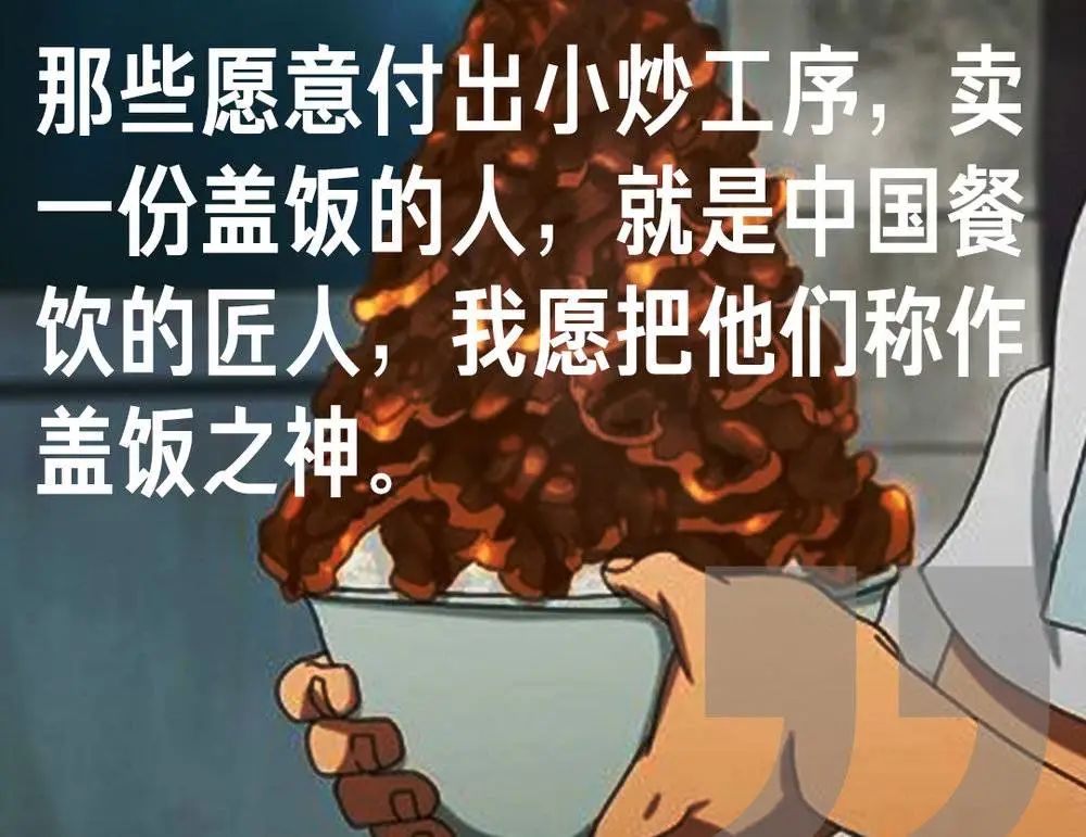在快写完这篇稿的时候,我约着我的朋友莽山烙铁头一起去了个小馆子吃盖饭,在抹嘴完事之后,他感悟到:“所以,那些愿意付出小炒工序,卖一份盖饭的人,就是中国餐饮的匠人,我愿把他们称作盖饭之神。”