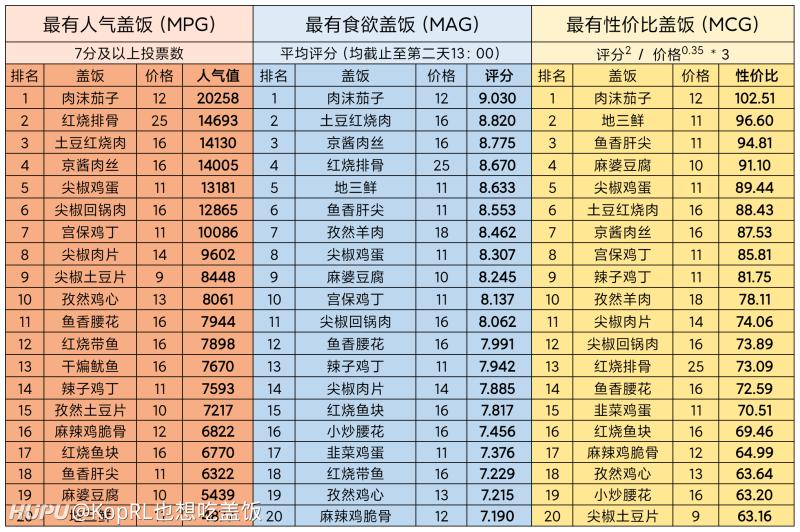狂热的“影迷”会在每一期更新之后,对盖饭本身进行投票,并在得到数据之后从3个维度,为每一份不曾在商业社会中拥有姓名的盖饭评选出Top 10榜单。