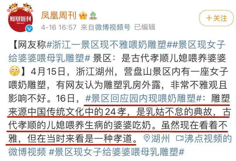 景区负责人先是解释说,这座引发争议的雕塑是整组“二十四孝”雕塑的其中一个,讲的是“乳姑不怠”的故事,目的是提倡尊老爱幼、孝顺父母的中华传统美德。