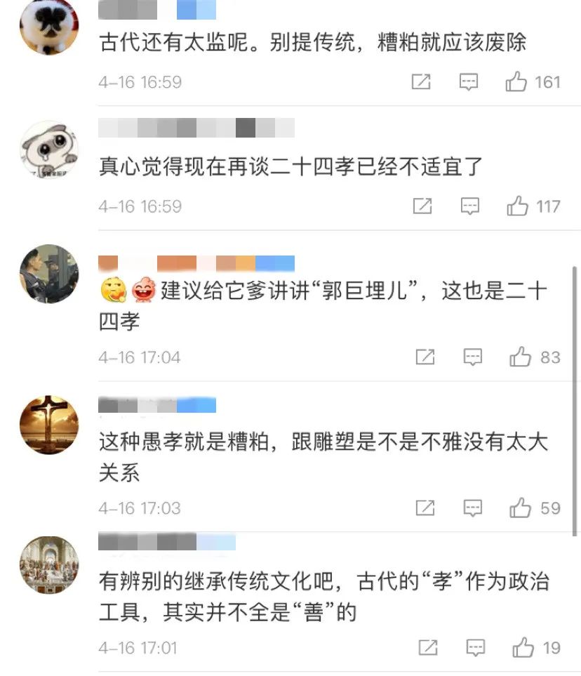 然后又说“二十四孝”是老祖宗一辈一辈传承下来的,现在的年轻人可能不理解,暗指网友没文化,连“乳姑不怠”的重要意义都不了解。结果这次回复激发了更加汹涌的网络热潮,现在迫于压力全部拆除,并表示景区的初衷“并非提倡愚孝和效仿此类方式”,估计心里还是不服气的。