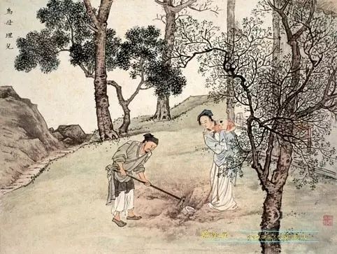 郭巨家里穷,为了侍奉母亲,决定把三岁的儿子活埋了,结果在挖坑的过程中挖到了一罐黄金,上面还写着“天赐郭巨,官不得取,民不得夺”,于是郭巨的儿子侥幸得活。