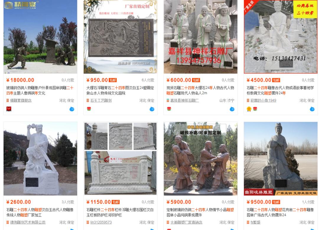 网上很多雕塑厂商都供应“二十四孝”雕塑,还卖得不错。在某宝上一搜一大把,这些雕塑去往哪里,都被卖到各种景区或者园林建筑中了。