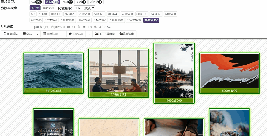 这时候你就会发现,不管是几 kb 的按钮图标,还是高清的 4K 图片,只要是在这个网页里以图片格式存在的文件,都会被提取出来。