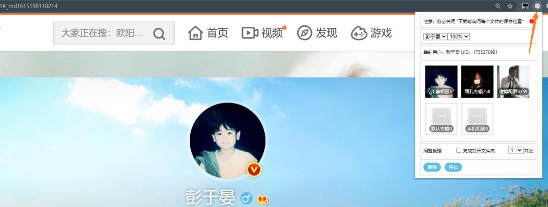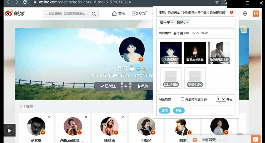 操作方法也很简单,安装好插件,在网页上登陆自己的微博账号,随后进入别人的微博主页,点击一下插件图标,即可读取到所有相册里的图片。