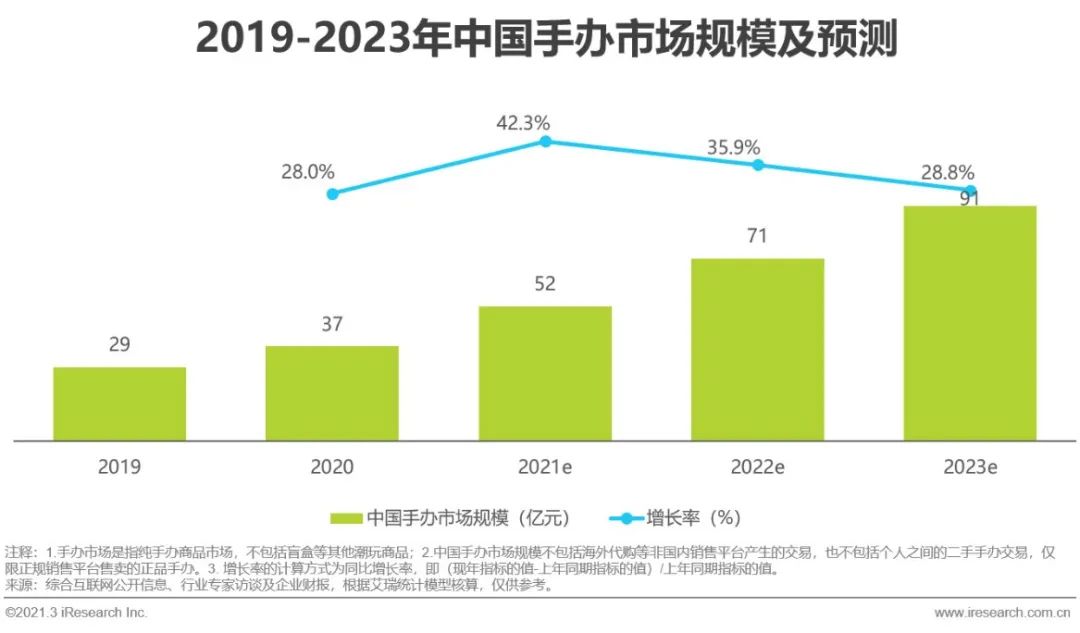 中国手办消费市场属于稳步增长的小众市场,2020年市场规模为36.6亿元。艾瑞咨询认为随着国潮手办的兴起和潮玩市场整体的带动,未来几年中国手办市场依然保持稳定增长的态势,预计2023年中国手办市场规模将突破90亿元达91.2亿元。