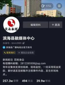 滨海融媒抖音号自2020年3月运营以来,粉丝量近40万,单条新闻点击量突破4000万。