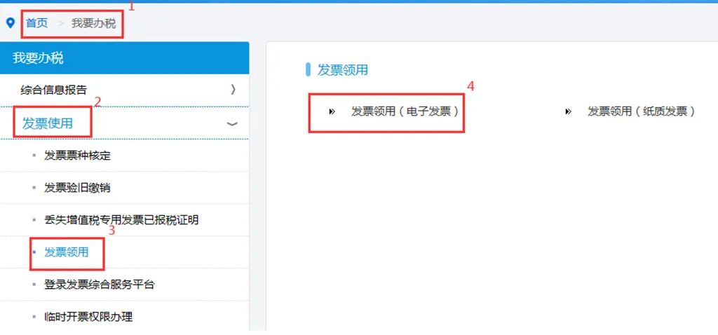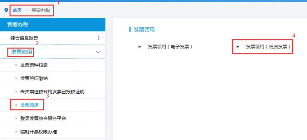 第二步:然后再点击【我要办税】--【发票使用】--【发票领用】--【发票领用】(纸质发票)/【发票领用】(电子发票)