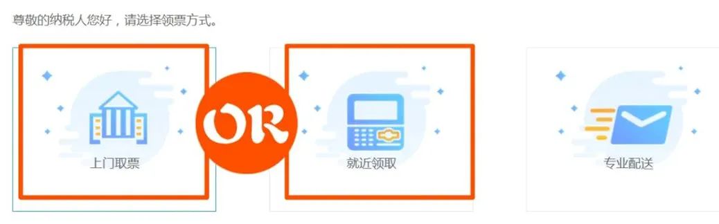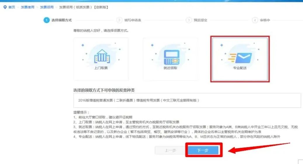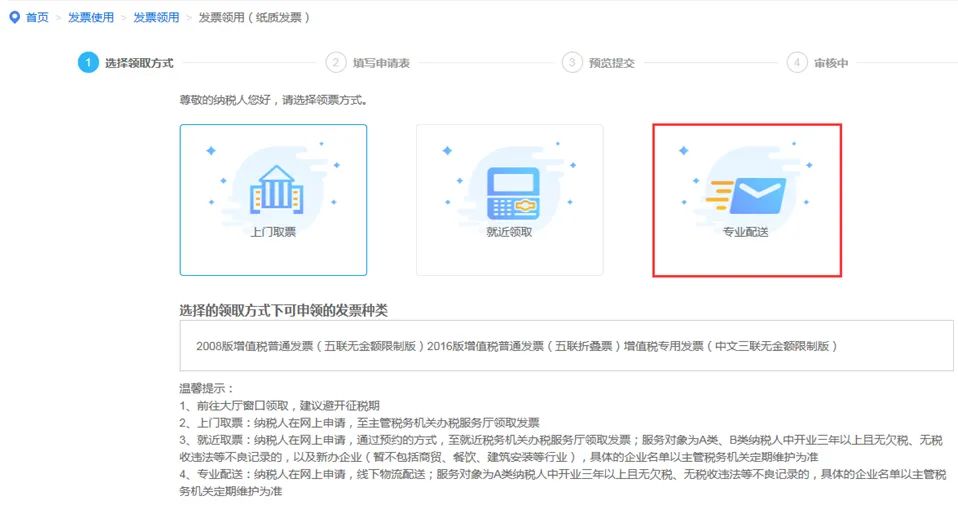 TIPS其中进入【发票领用】(纸质发票),进入办理页面可以选择【专业配送】/【上门取票】/【就近取票】。