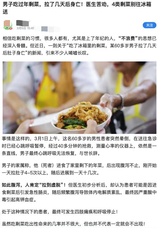 最近,好多朋友发来一篇文章求助。文章里说,一个男子吃了过年剩菜,结果导致急性胃肠炎,拉肚子好几天后身亡,