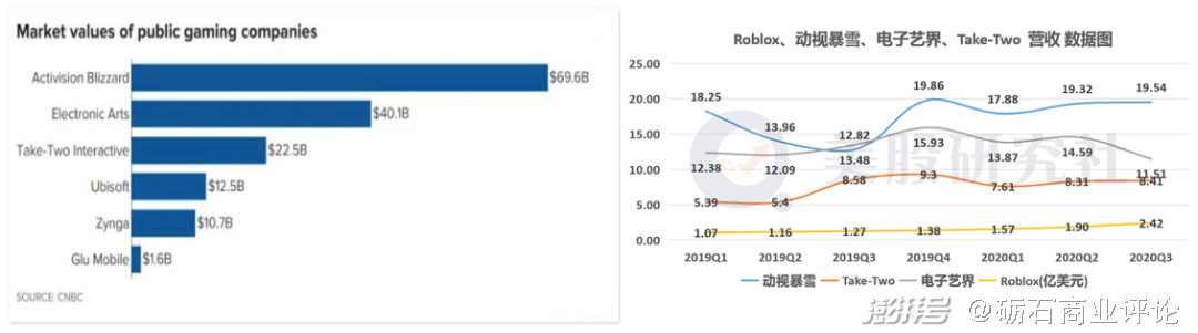 上市之后,Roblox的市值一度高达450亿美元,比今年1月的融资估值高出了53%,当时Roblox估值为295亿美元,融到了5.2亿美元。Roblox的市值还一度超过老牌游戏公司电子艺界Electronic Arts(EA),且一直高于Take-Two。上述两家公司营收明显更高,且盈利,而Roblox已连续亏损多年,且亏损幅度不断扩大。