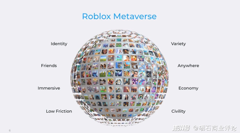 在众多进入赛道的公司中,Roblox是首个将“元宇宙”写进招股说明书的公司,被称为“元宇宙”概念股。Roblox提到,有些人把我们的范畴称为“元宇宙”,这个术语通常用来描述虚拟宇宙中持久的、共享的、三维虚拟空间。随着越来越强大的计算设备、云计算和高带宽互联网连接的出现,“元宇宙”将逐步变为现实。除此之外,Roblox还提出了通向“元宇宙”的8个关键特征,即Identity(身份)、Friends(朋友)、Immersiveness(沉浸感)、Low Friction(低延迟)、Variety(多样性)、Anywhere(随地)、Economy(经济)、Civility(文明)。这也是第一家商业公司尝试概括描述“元宇宙”特征。