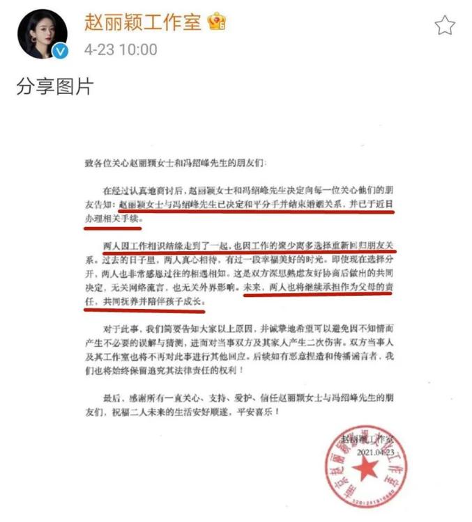 在经过认真地商讨后赵丽颖女士和冯绍峰先生决定向每一位关心他们的朋友告知:赵丽颖女士与冯绍峰先生已决定和平分手并结束婚姻关系,并已于近日办理相关手续。
