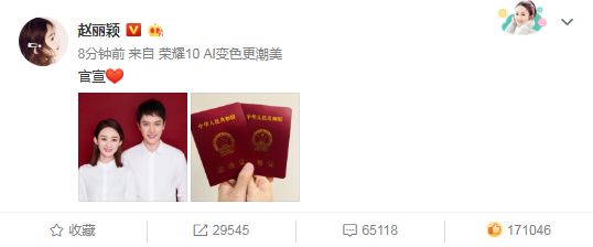 2018年10月16日10点07分,赵丽颖在31岁生日当天,与冯绍峰大方公开两人结婚证,配文“官宣”正式宣布结婚喜讯。
