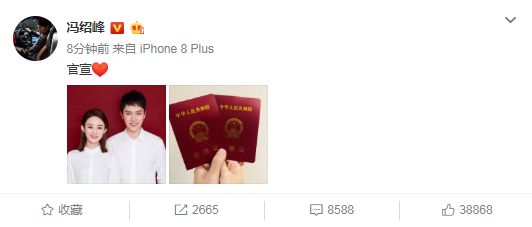 2018年10月16日,冯绍峰赵丽颖晒出结婚证官宣结婚;