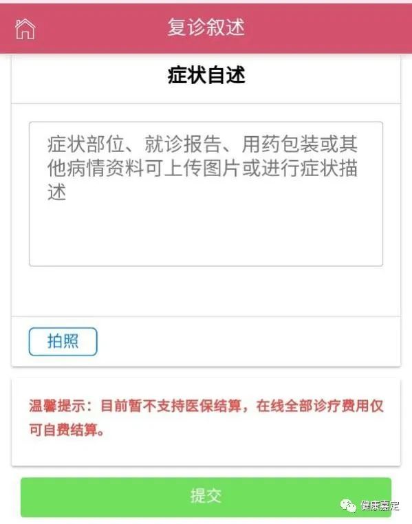 进入主页面,点击【在线复诊】,选择就诊科室、就诊时段和就诊人,提交病史资料,即可完成本次复诊预约