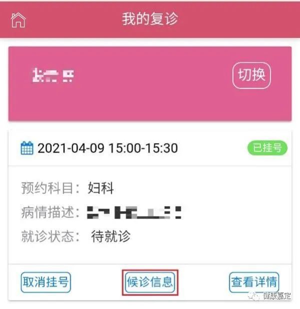 进入【个人中心】-【我的复诊记录】-查询【候诊信息】